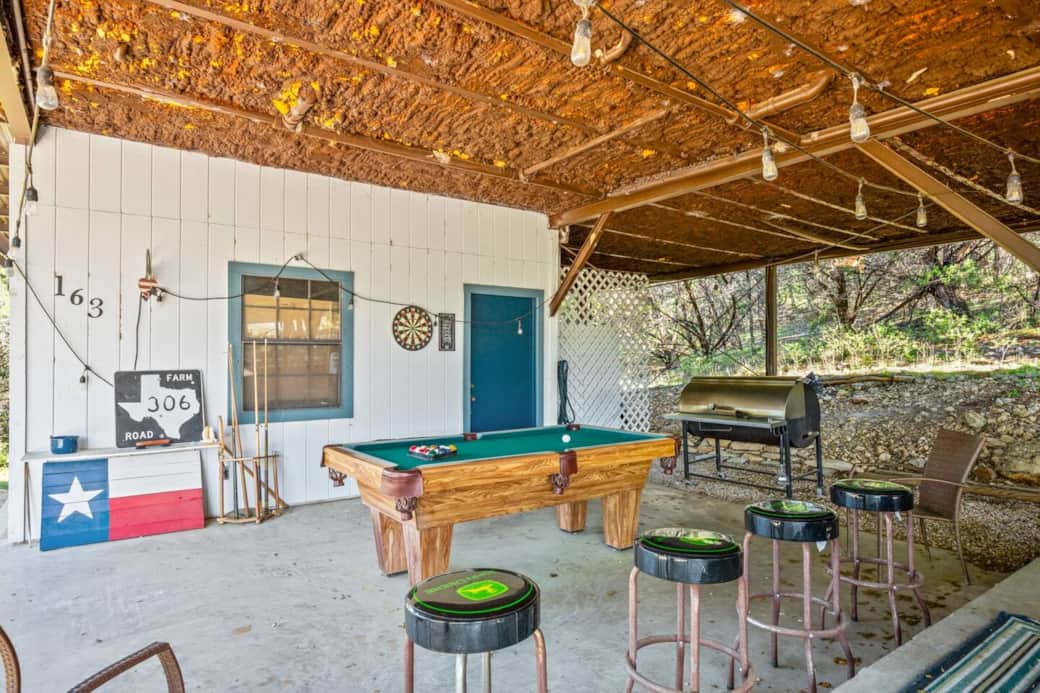 This adorable canyon view treehouse is over 1500 ft² and has room for 4 on a king bed and a queen bed. Enjoy a game of pool, darts, or cornhole then relax in the hot tub or around the fire pit. We are experienced Airbnb hosts and can't wait to welcome you to Canyon Lake!